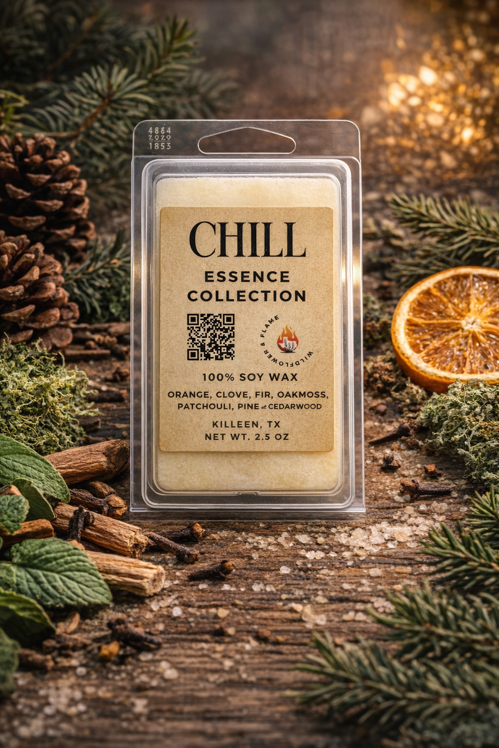 Chill is grounding, earthy, and quietly warming. Bright orange opens the scent with subtle citrus lift, while clove adds gentle spice. Fir and pine bring a fresh woodland edge, balanced by oakmoss, patchouli, and smooth cedarwood for depth and calm. Comforting without being heavy, it’s designed to settle the space and slow the moment.